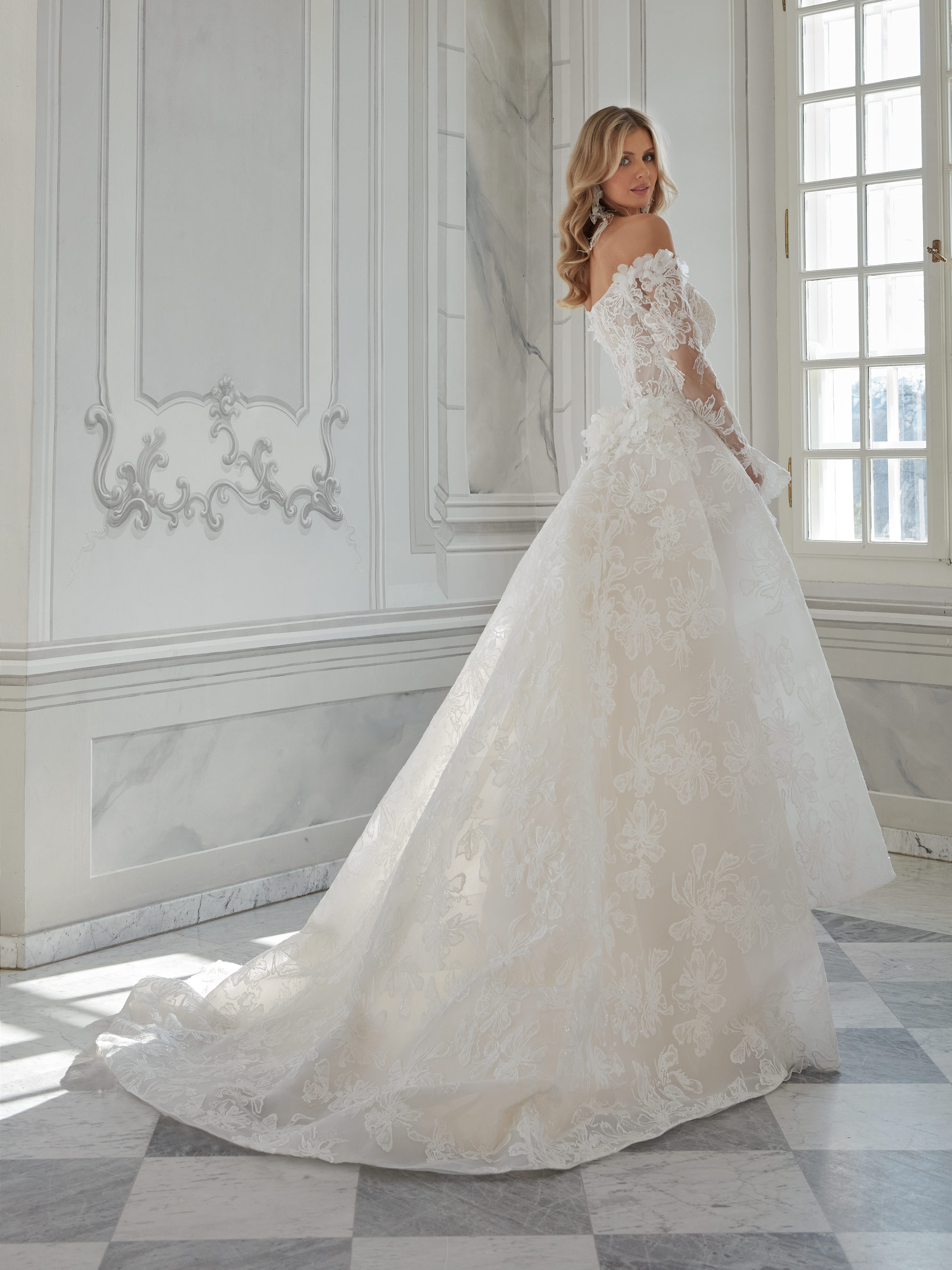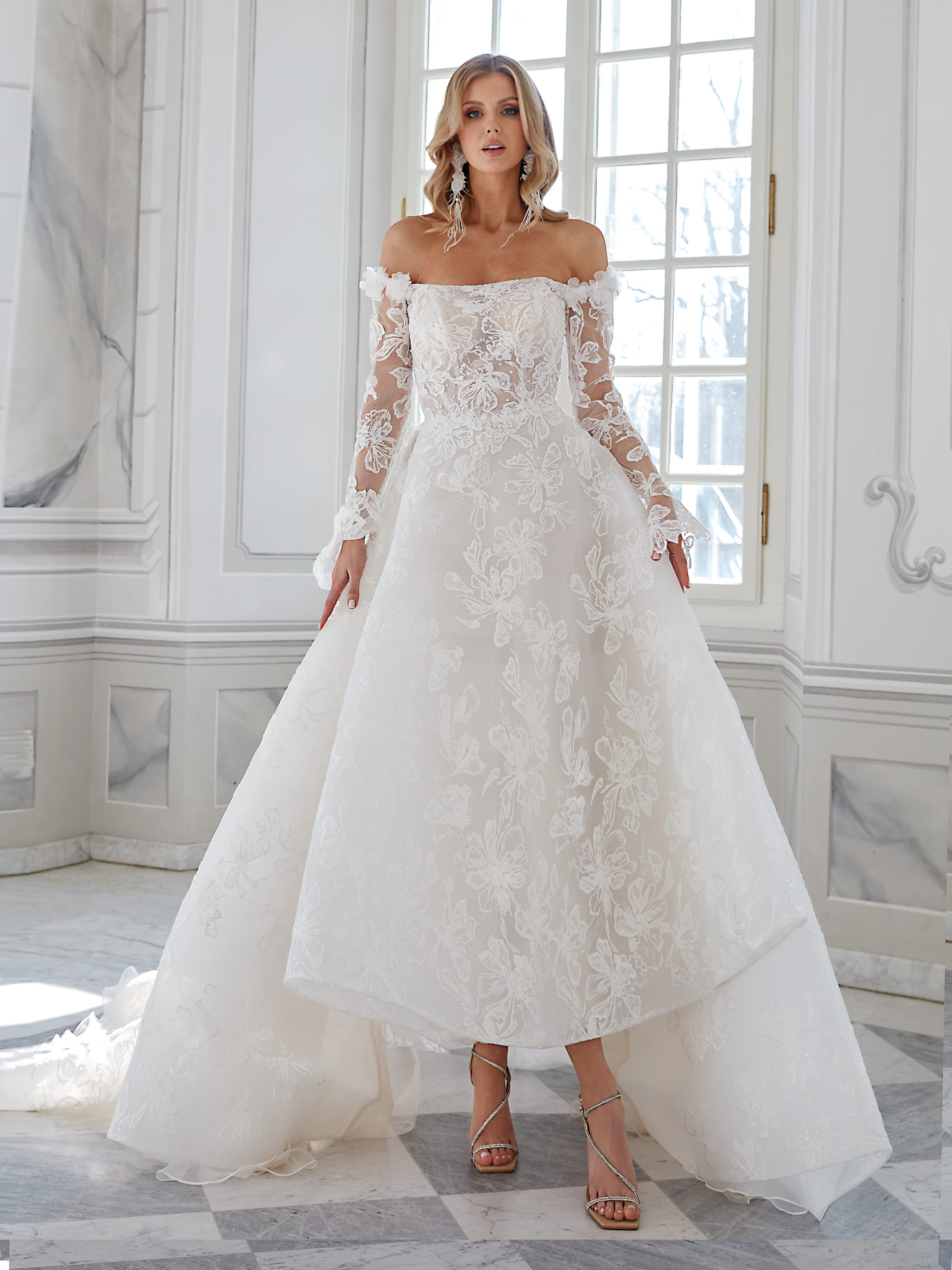Kalani is a unique wedding dress that captivates with its bold high-low silhouette. The lace bodice with an off-the-shoulder neckline and sheer long sleeves creates a delicate, romantic feel. The front reveals the legs for a daring touch, while the dramatic train at the back adds grandeur and timeless elegance. A perfect choice for a bride who seeks to blend tradition with modern flair.