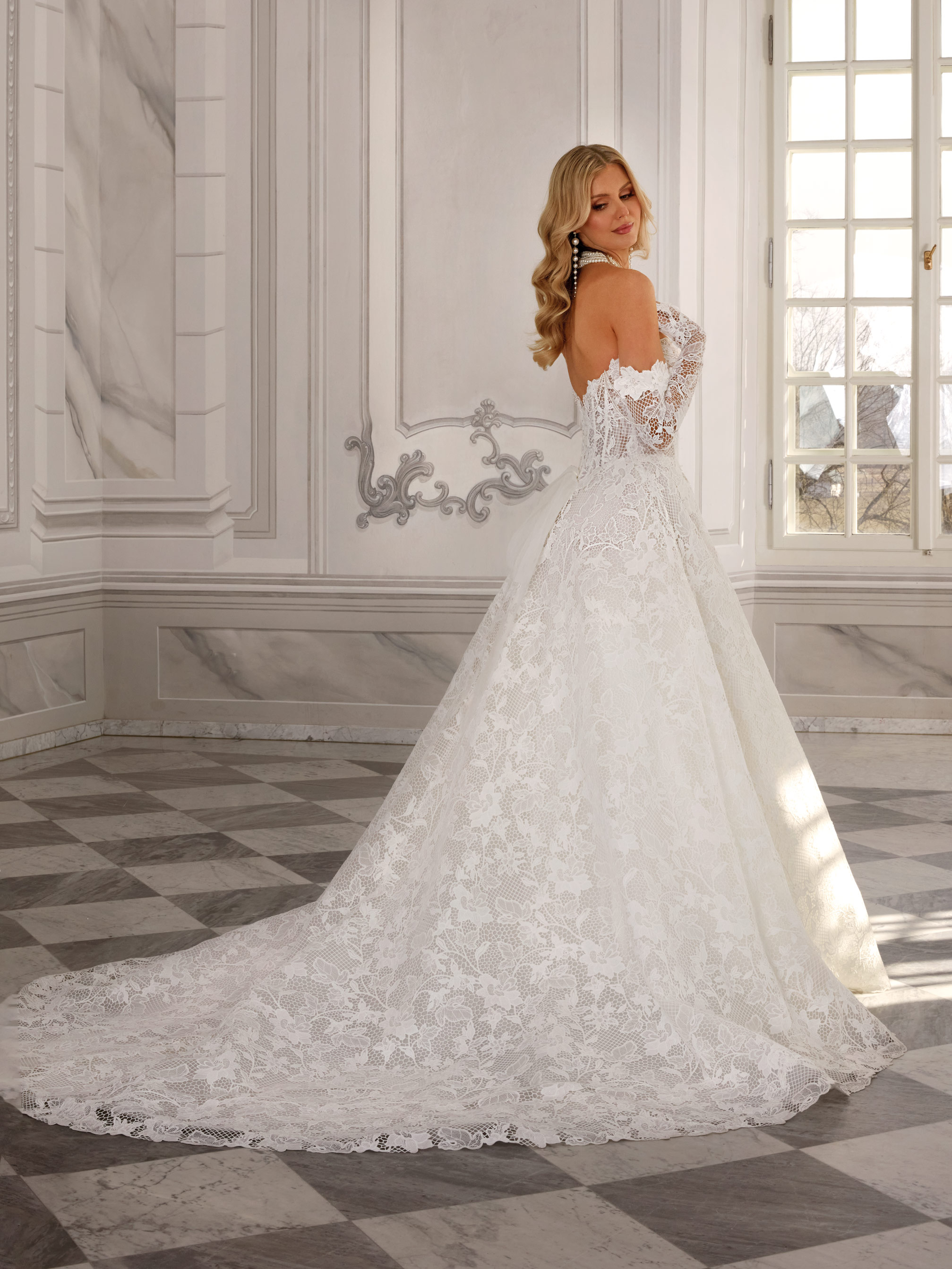 Sensual Kamila is a classic-style gown fully covered in delicate, uniform lace. The sweetheart neckline highlights the figure, while long fitted sleeves add elegance. The neckline is adorned with subtle pearl chains, adding a soft jewelry-like touch. An open back and long lace train complete this chic and romantic look.