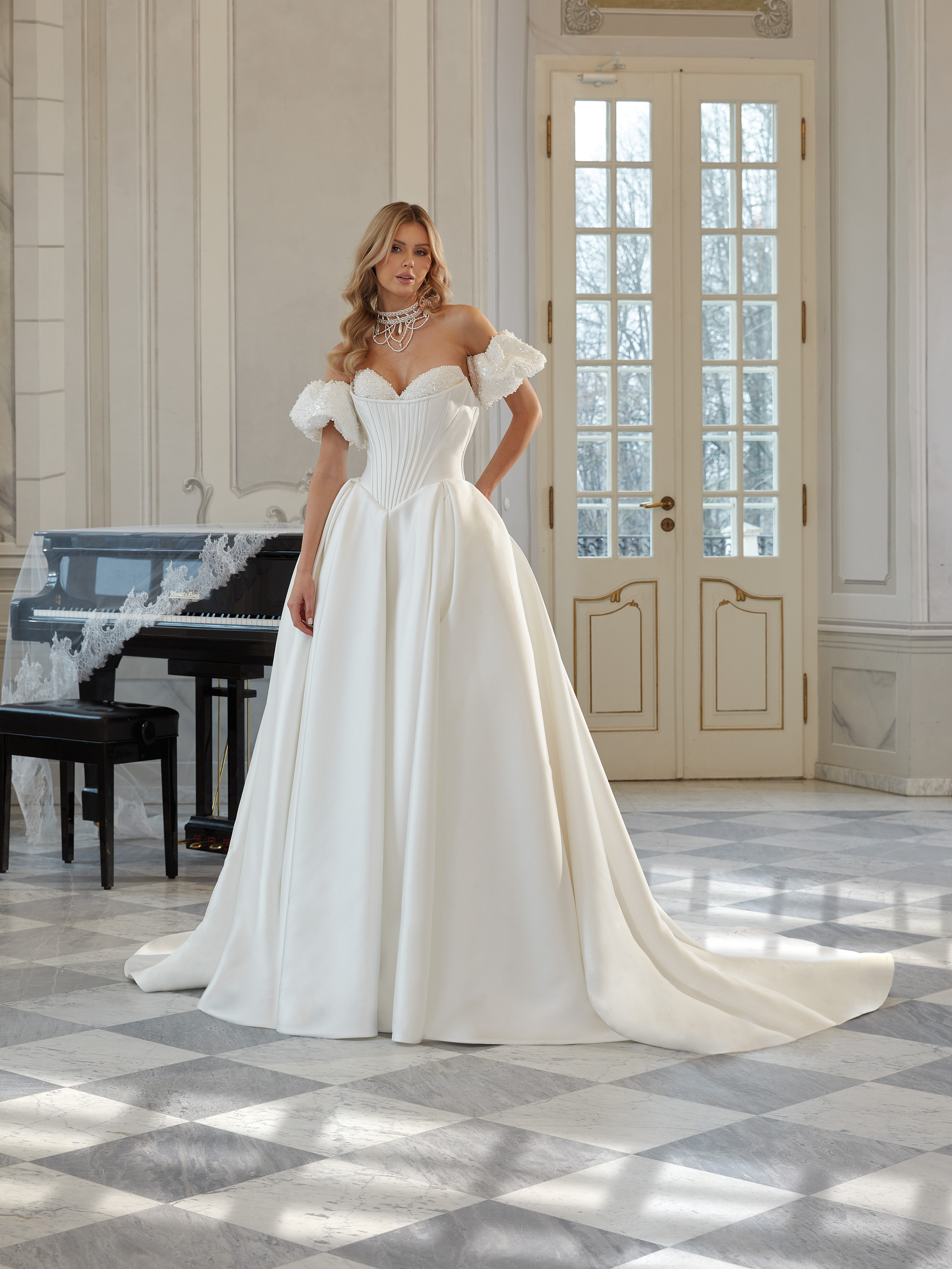 A classic wedding gown crafted from subtly shimmering fabric. The bodice features visible boning and a heart-shaped neckline that enhances the figure. Soft off-the-shoulder sleeves add a romantic feel. The open back and sweeping train complete the elegant look.