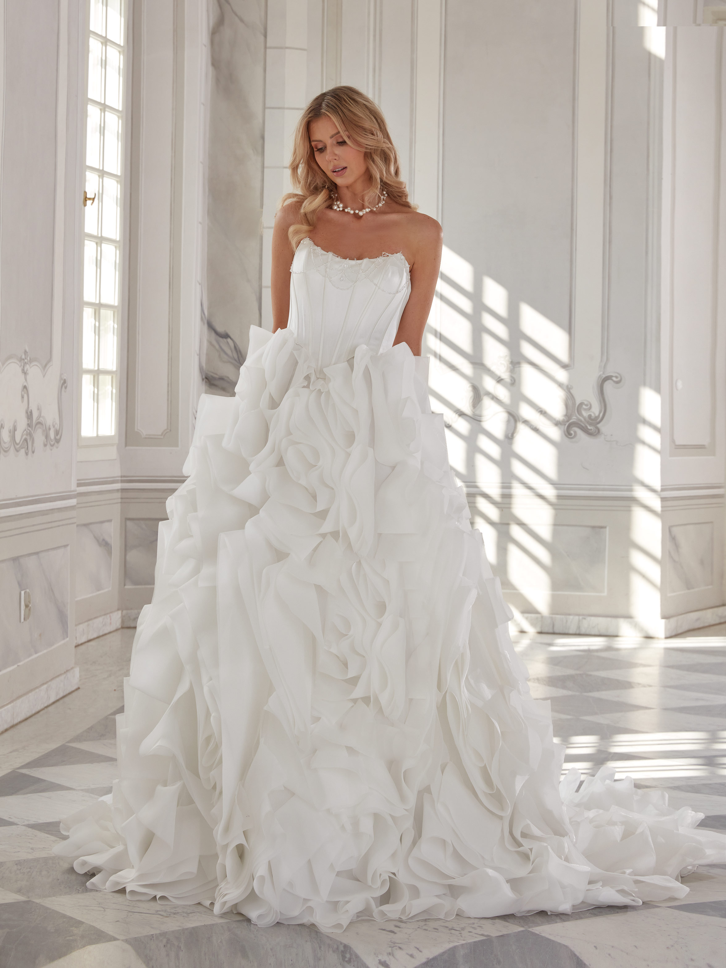 This showstopping wedding gown features a voluminous skirt made of cascading 3D ruffles for dramatic texture and movement. The satin corset, detailed with subtle crystal embellishments and exposed boning, shapes the silhouette beautifully. A clean sweetheart neckline adds elegance and softness. A bold yet romantic choice for a modern bride.