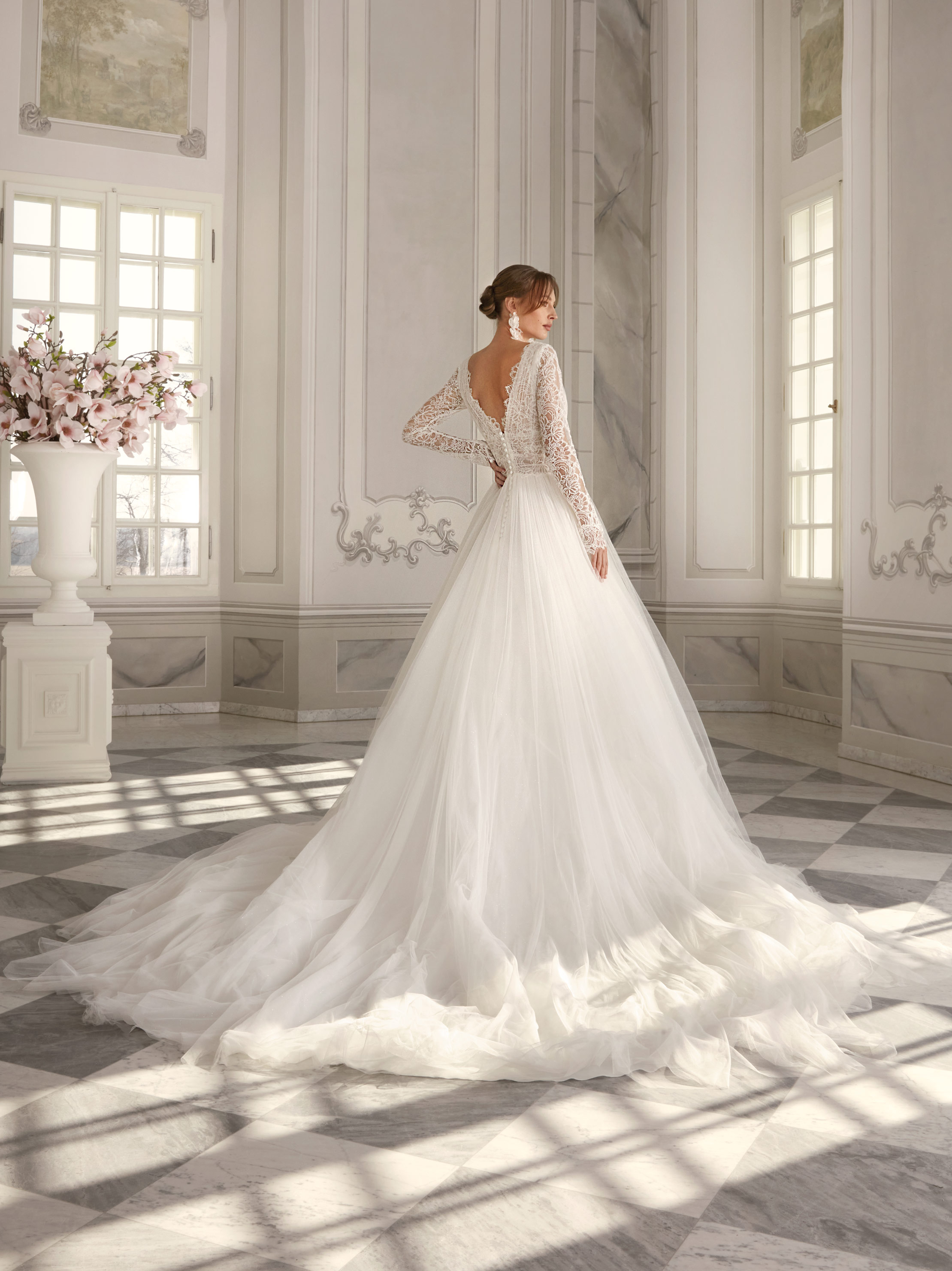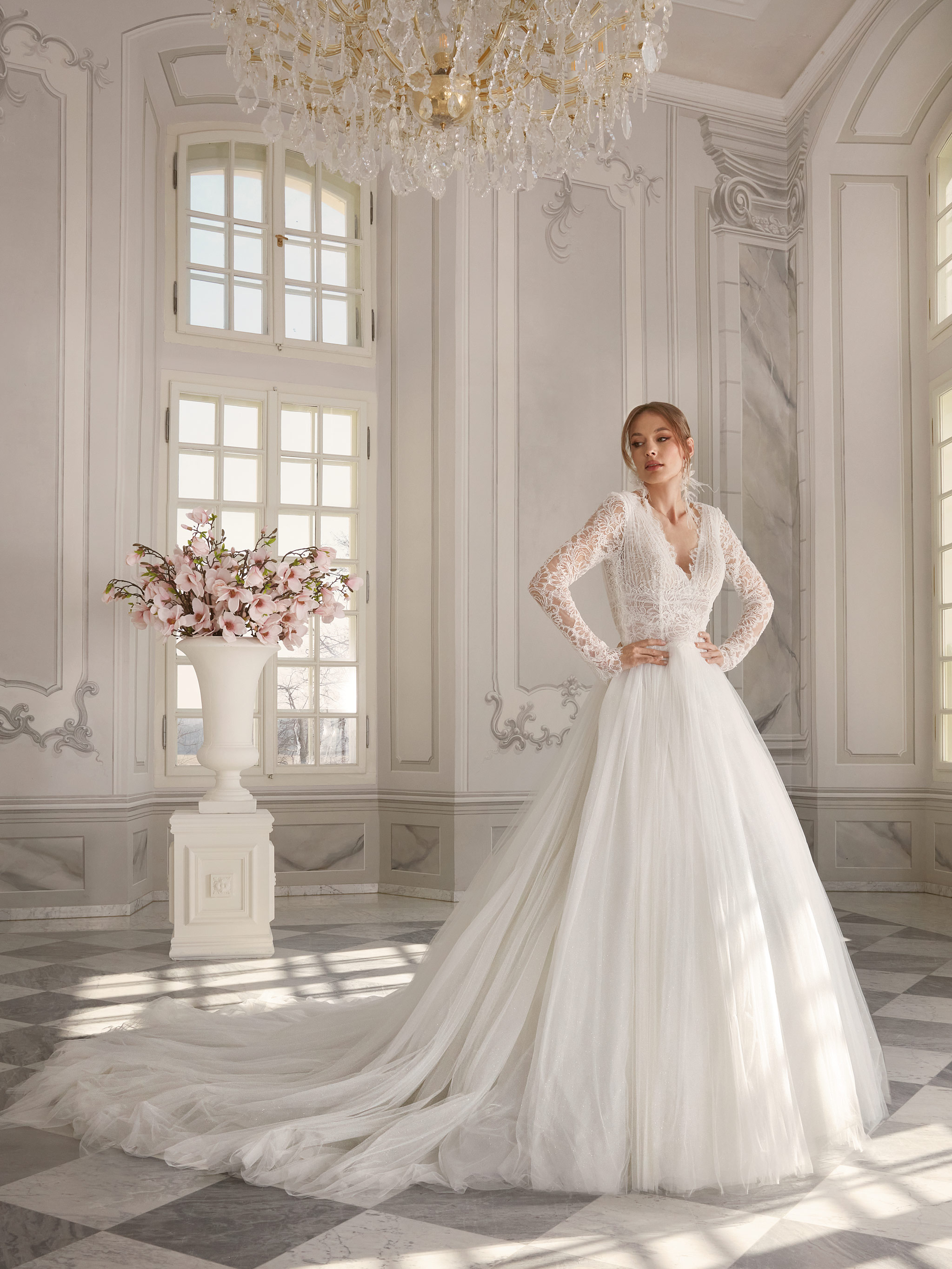 The NINA 2682 gown enchants with its romantic design. A lace bodice with long sleeves and a V-neckline highlights the figure, while the airy tulle skirt with a soft train adds elegance and grace.