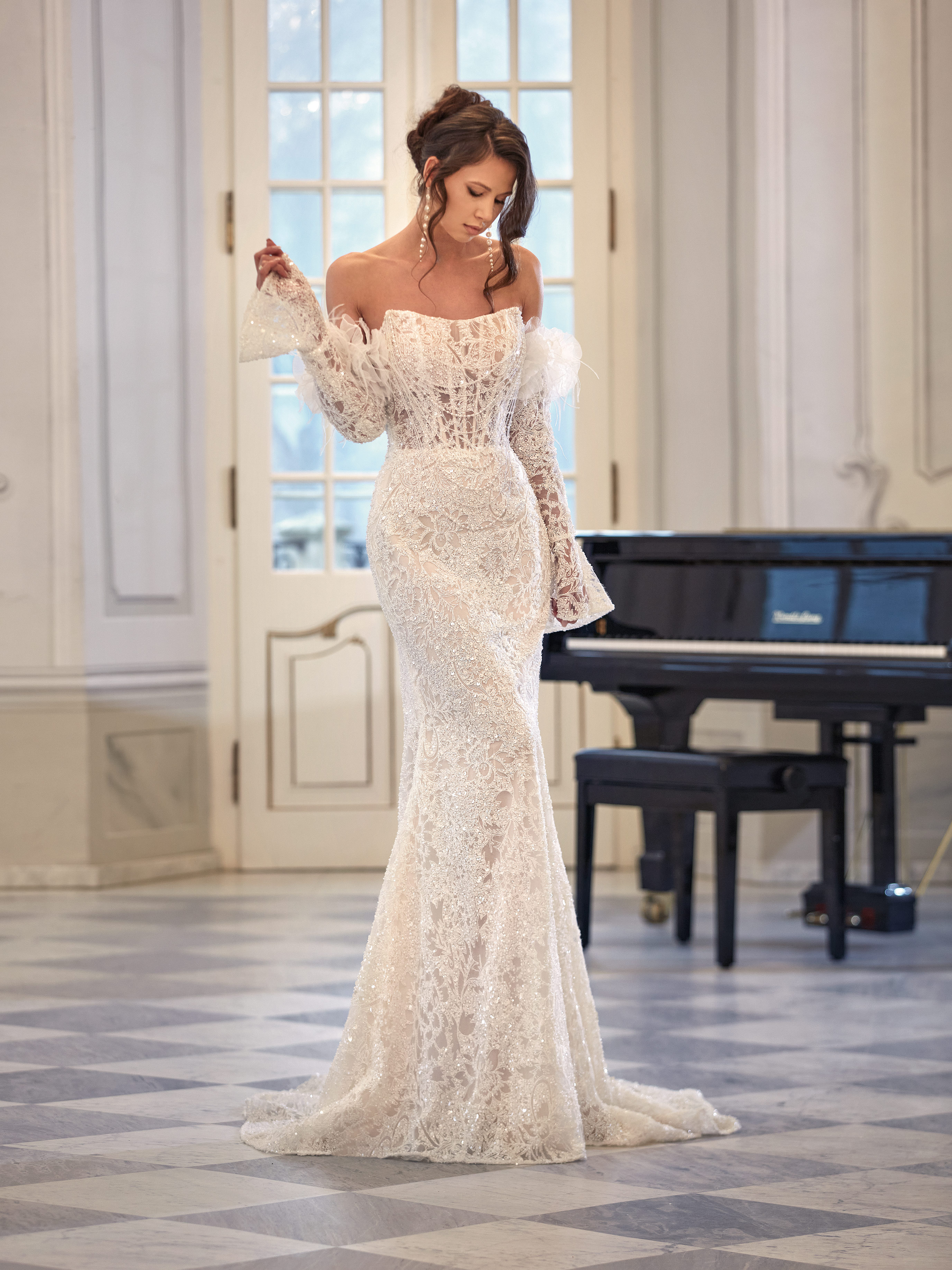 Nova is a striking bridal gown designed for brides who love to stand out. The off-the-shoulder lace bodice beautifully frames the neckline and shoulders, while the dramatic feather-trimmed sleeves add a touch of flair. The fitted lace-covered skirt enhances the figure, and the detachable tulle train with cascading ruffles creates a show-stopping silhouette with the option for a look transformation.