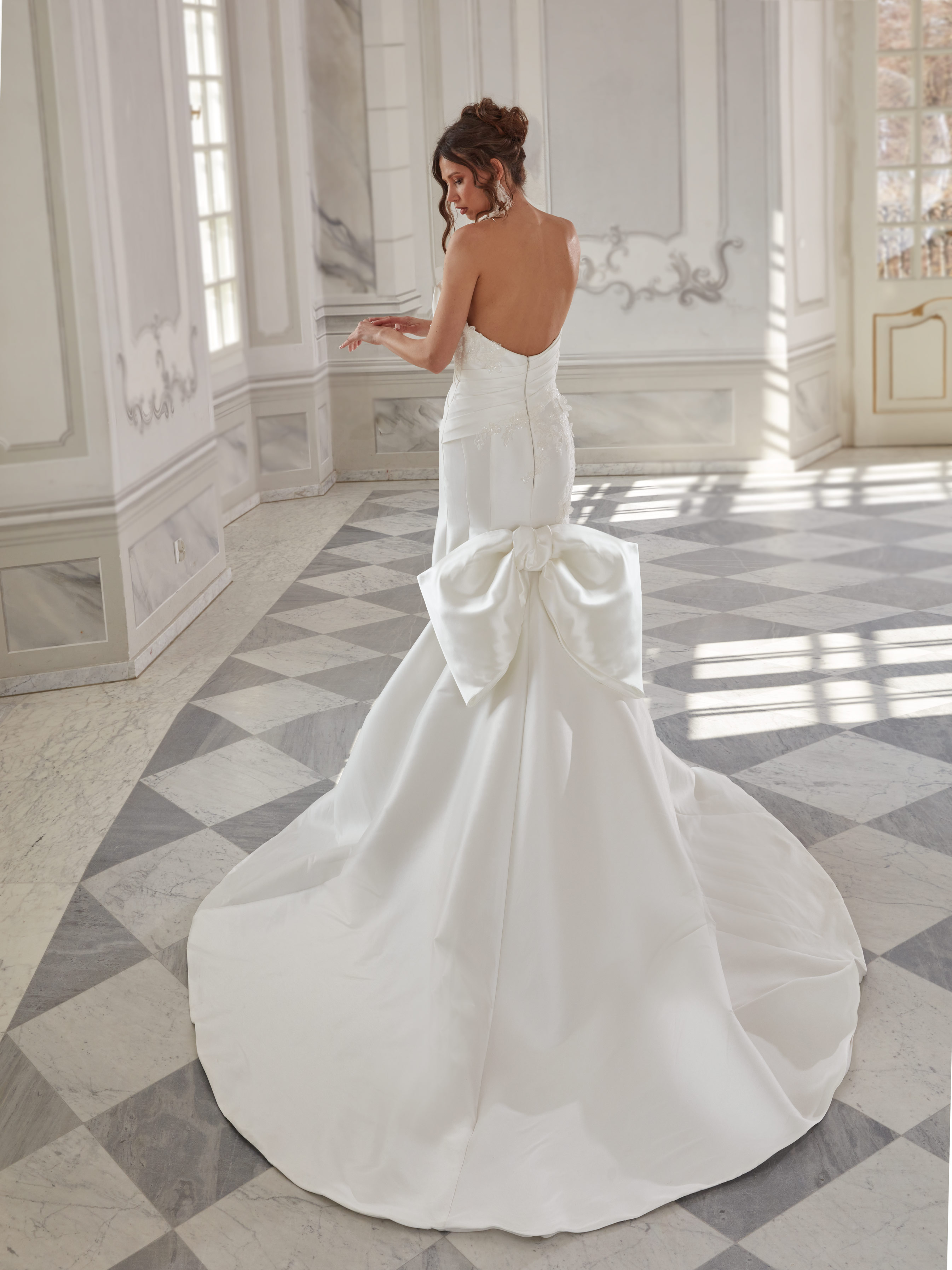 A satin mermaid wedding dress with a clean silhouette and refined details. The bodice features a modern asymmetrical ruffle draping the neckline and shoulders. Delicate floral appliqués add a touch of romance, while a large bow with a train at the back completes the look with graceful elegance.