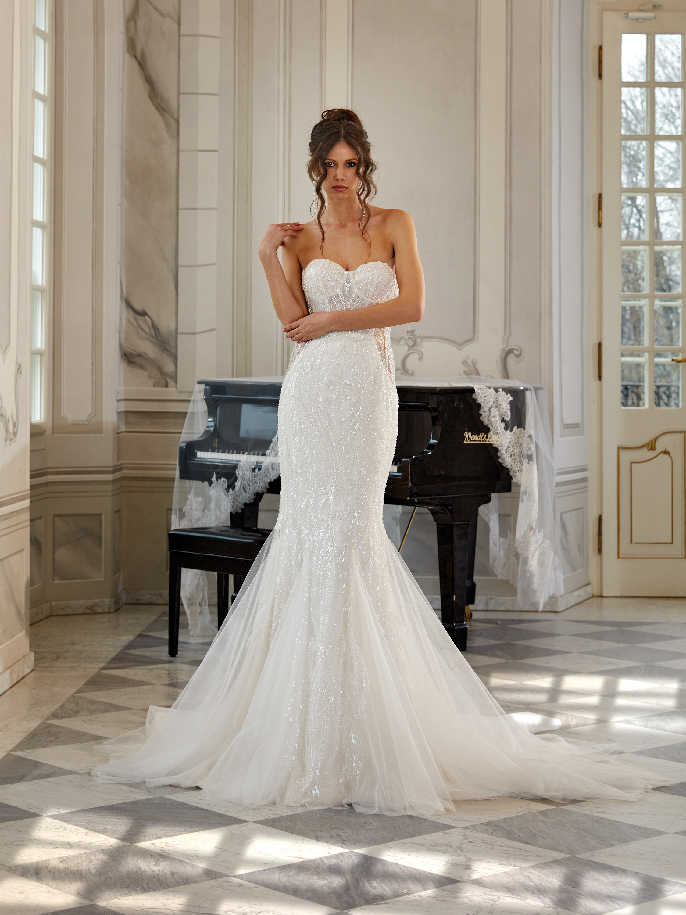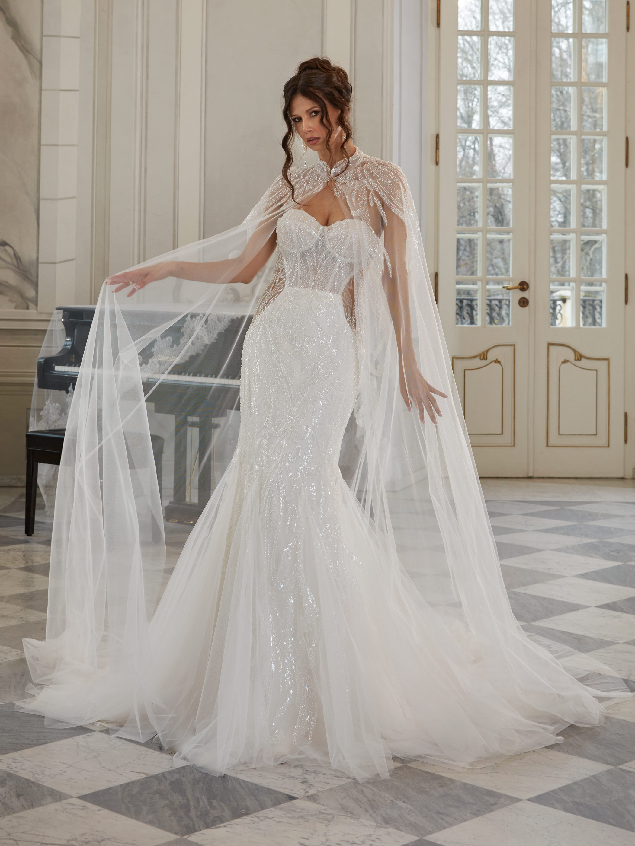 Poppy is a sensational mermaid-style wedding gown that enchants with intricate embroidery and radiant detailing. The sweetheart neckline with subtle sheerness accentuates the figure, while the fitted silhouette gracefully contours the body. A detachable tulle train, designed as a dramatic cape with ornate embellishments on the shoulders and back, adds a theatrical flair and a touch of uniqueness. Poppy is perfect for the bride who wants to make a lasting impression.