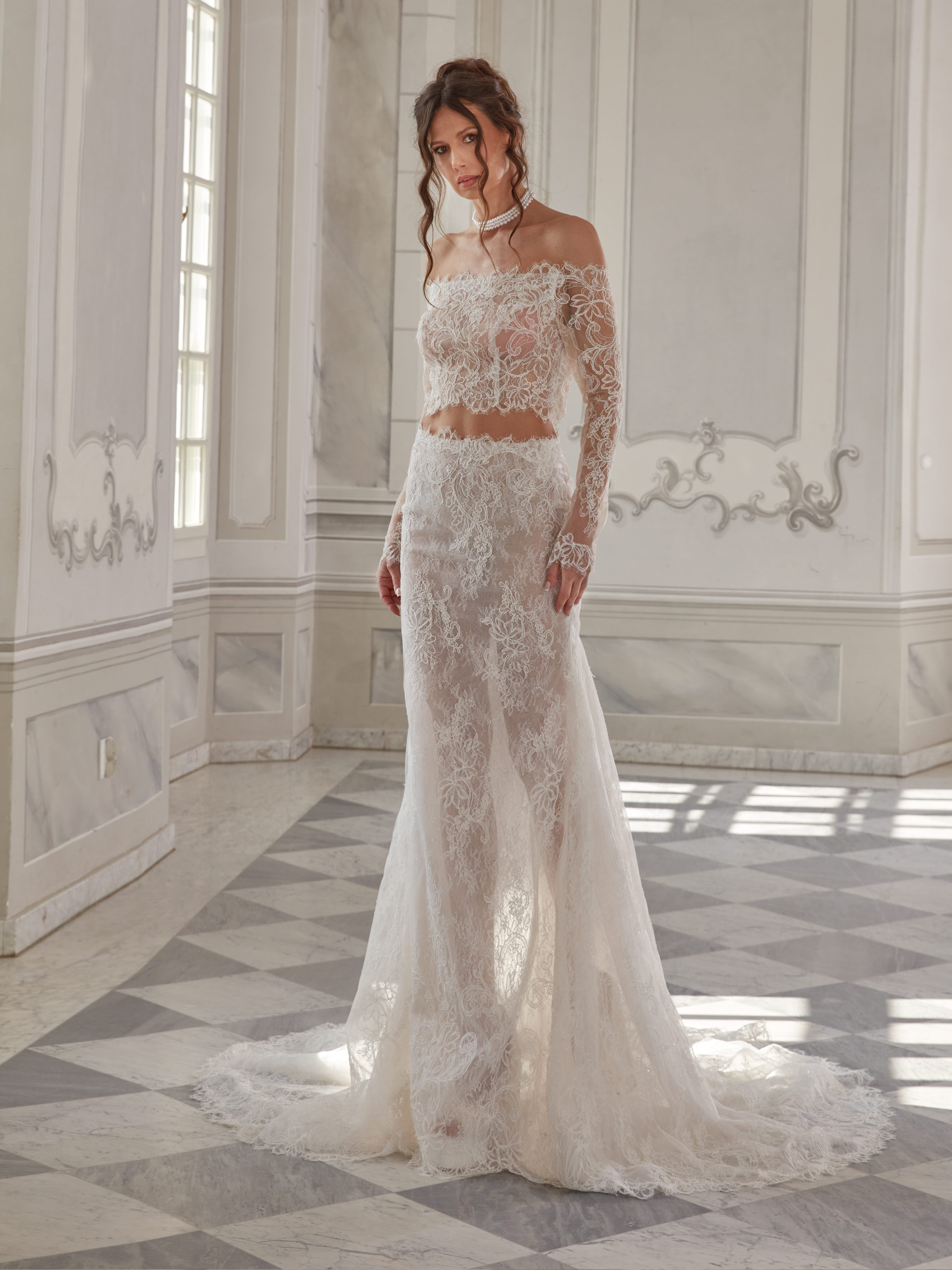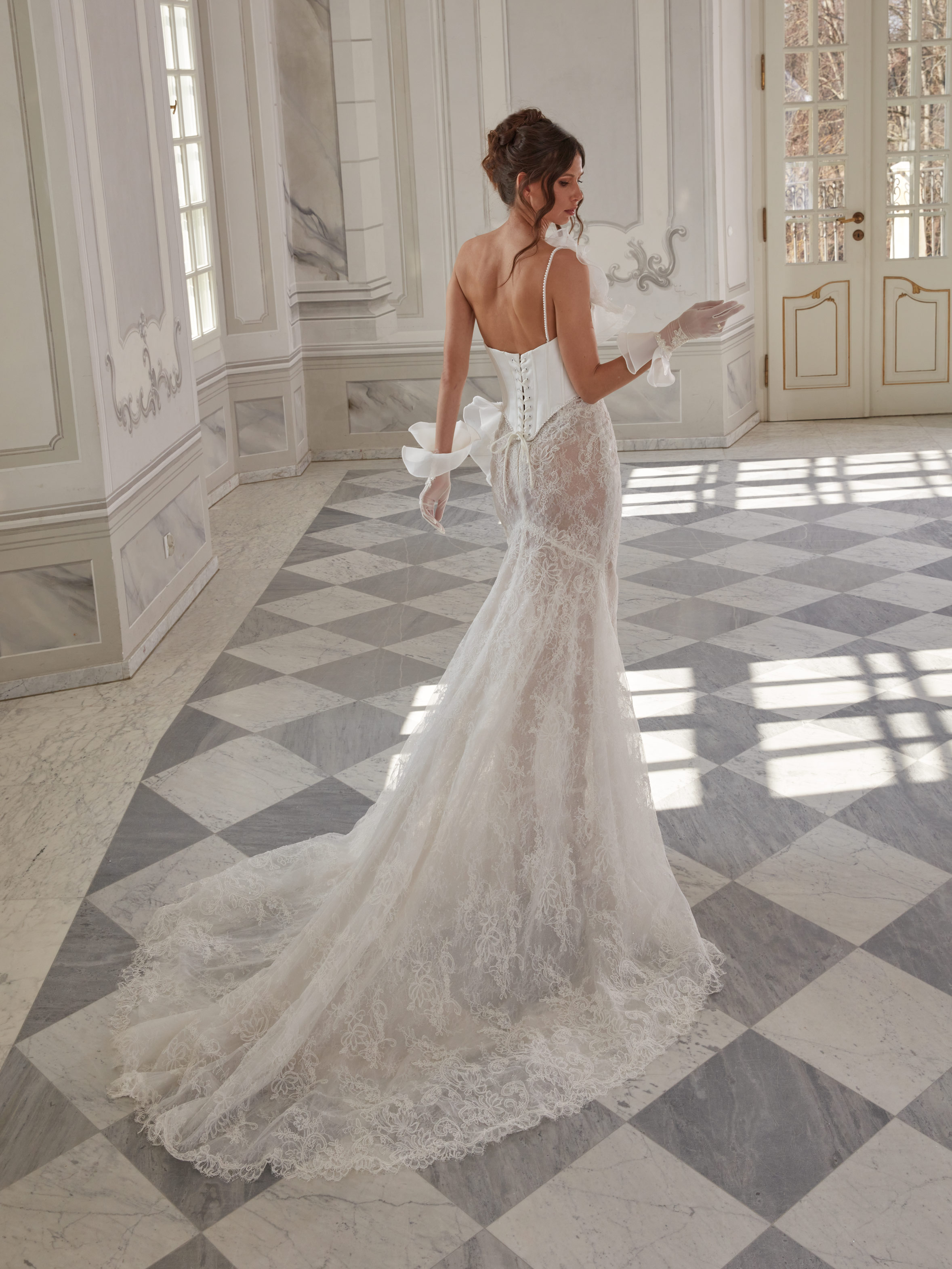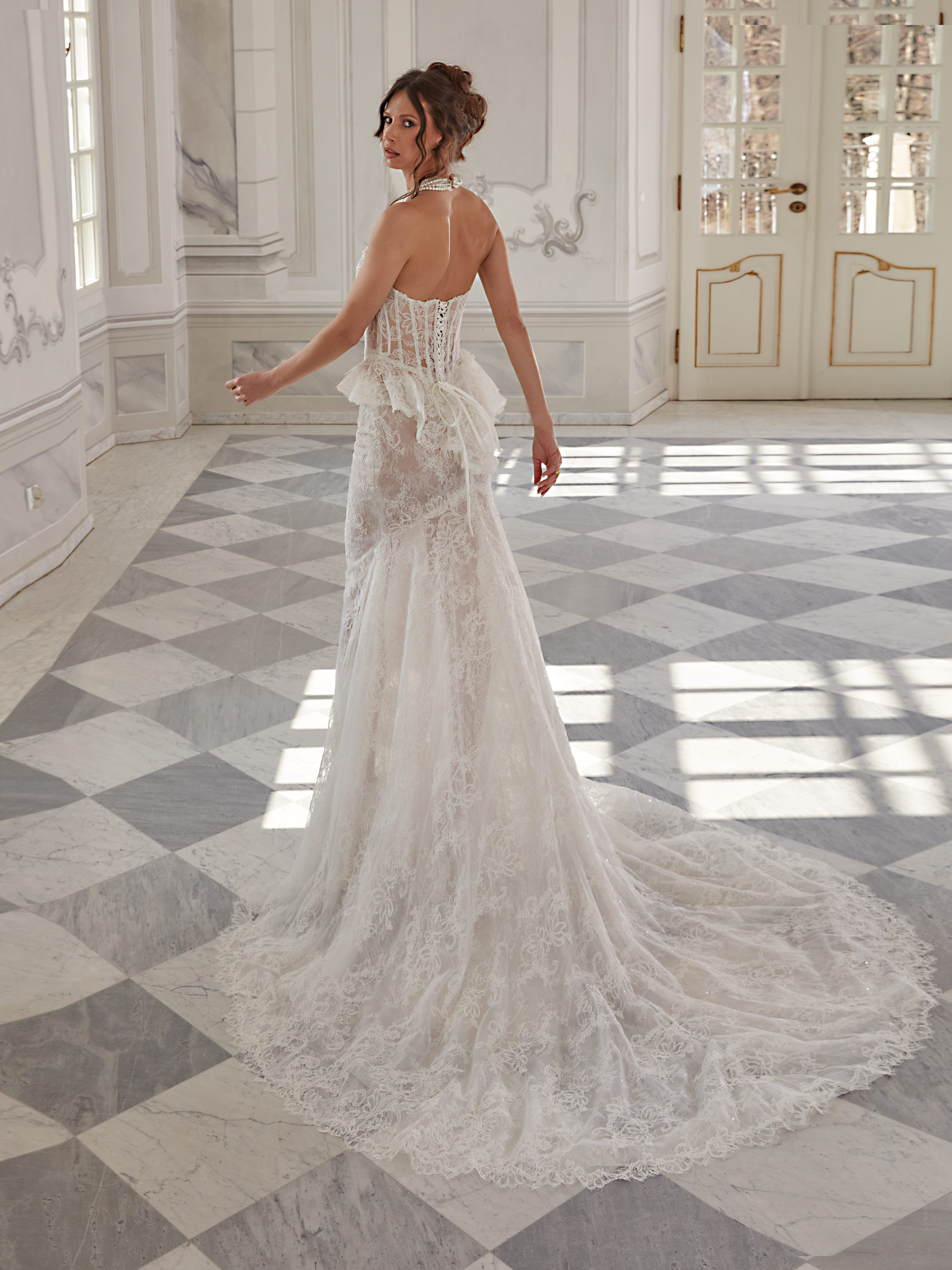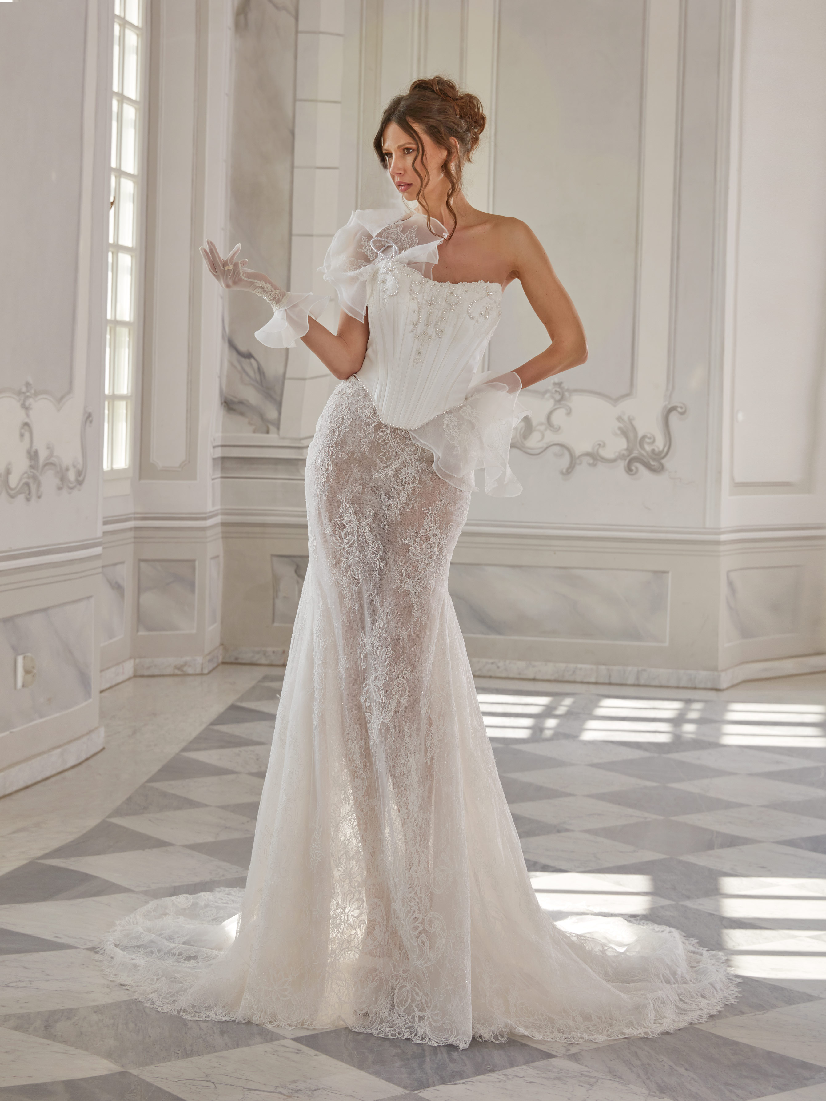 Presley is a bold and sensual wedding gown. The figure-hugging lace fabric, paired with a peplum-style corset, beautifully accentuates the waist and hips. Sheer lace creates a soft illusion effect, while a tulle bow at the back transforms into statement sleeves. A perfect choice for a bride who desires both elegance and a modern twist.