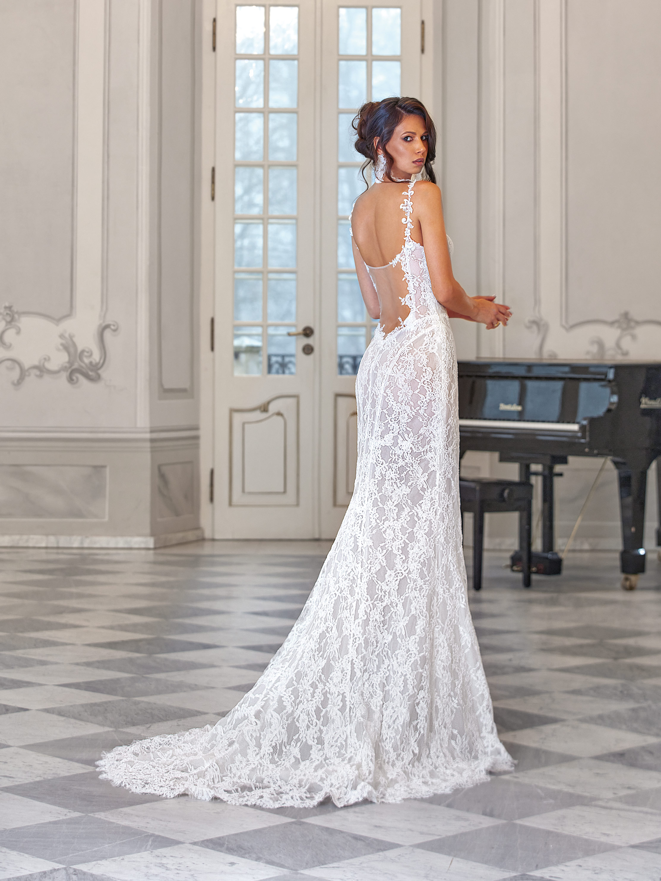 Prue is a graceful bridal gown crafted from intricate floral lace. The fitted bodice with delicate flower-like straps frames the shoulders and neckline, while the open back adds a touch of lightness. A voluminous skirt with a flowing train brings timeless elegance. Perfect for a romantic bride with a hint of vintage style