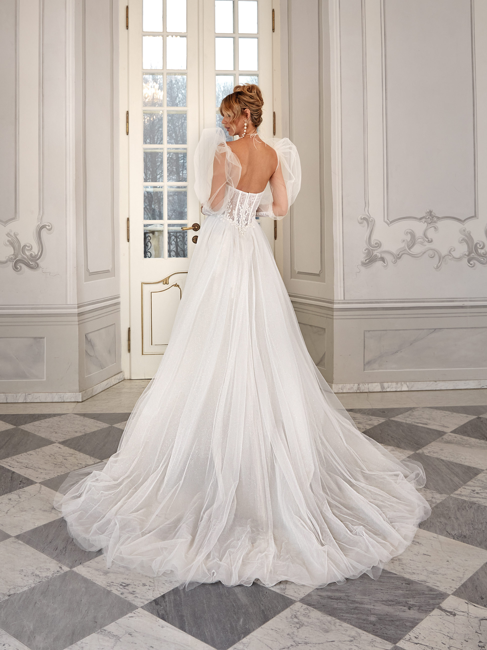 Ramona is a wedding dress that merges classic elegance with a touch of theatrical flair. The sheer corset with decorative lacing accentuates the silhouette and complements the heart-shaped neckline. The soft skirt is crafted from subtly shimmering tulle. Voluminous tulle sleeves complete the look, adding a romantic and fairytale-like charm.